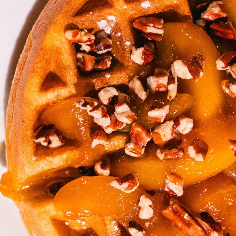 Golden Belgian waffles topped with brown butter bourbon roasted peaches, toasted pecans, and whipped cream | Pro tip: Add Vanilla Ice Cream Scoop +$1.5
