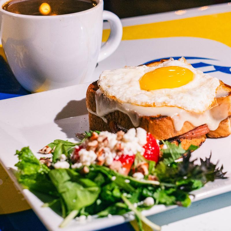 Grilled ham and swiss on Texas toast, smothered in sausage gravy, topped with a fried egg, and served with a heart of romaine salad | Pro tip: Pair with a Bloody Mary